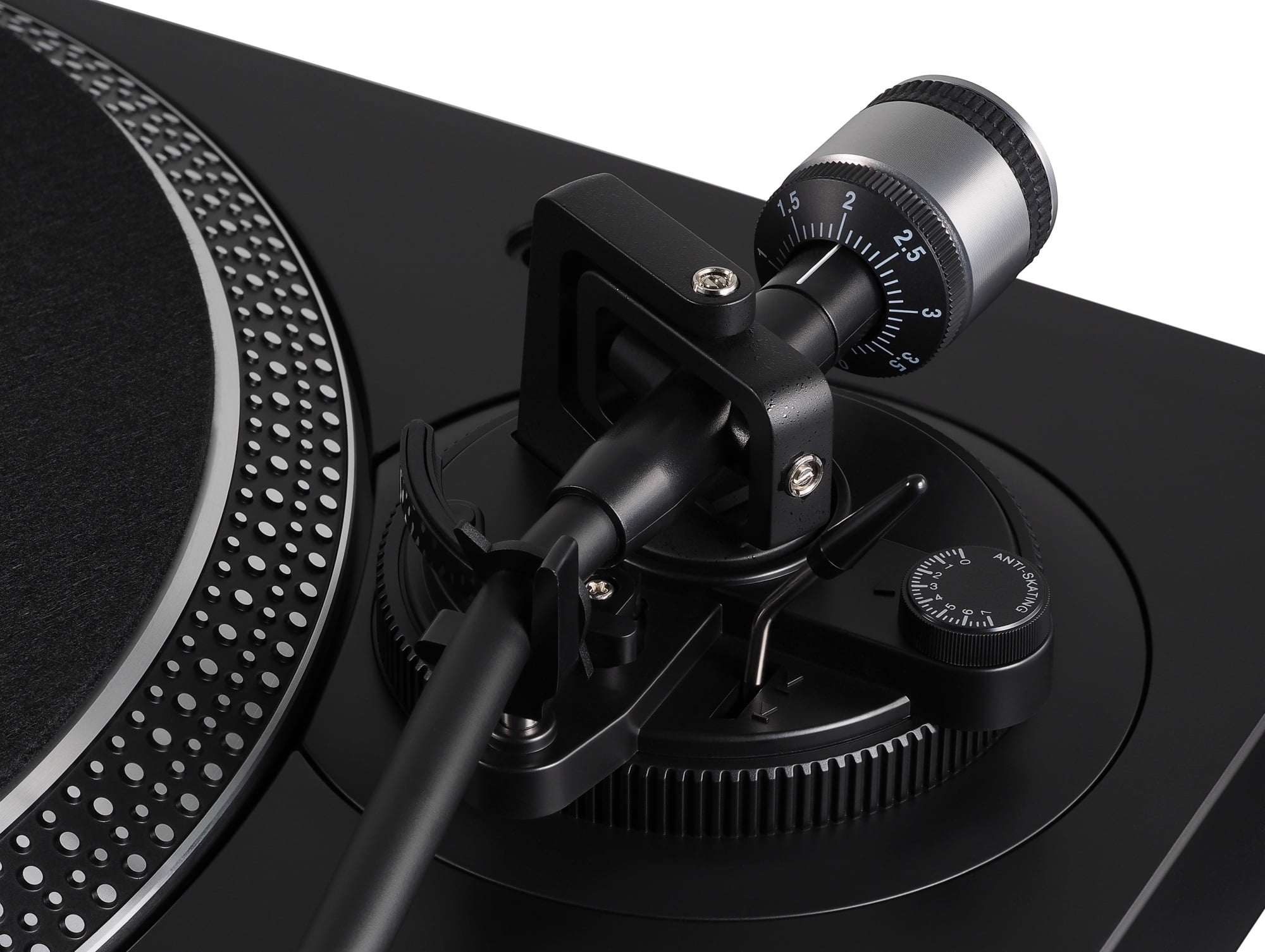 The turntable also features an S-shaped tonearm with adjustable tracking force and an AT-HS6 universal ½”- mount headshell with an AT-VM95E Dual Moving Magnet™ phono cartridge. Audio-Technica has been a leader in phono cartridge design for more than 50 years, and that expertise shows in the versatile, high-performance AT-VM95E. The cartridge comes with a 0.3 x 0.7 mil elliptical stylus, but is also compatible with any VM95 Series replacement stylus, offering a wide choice of options for every budget and application.