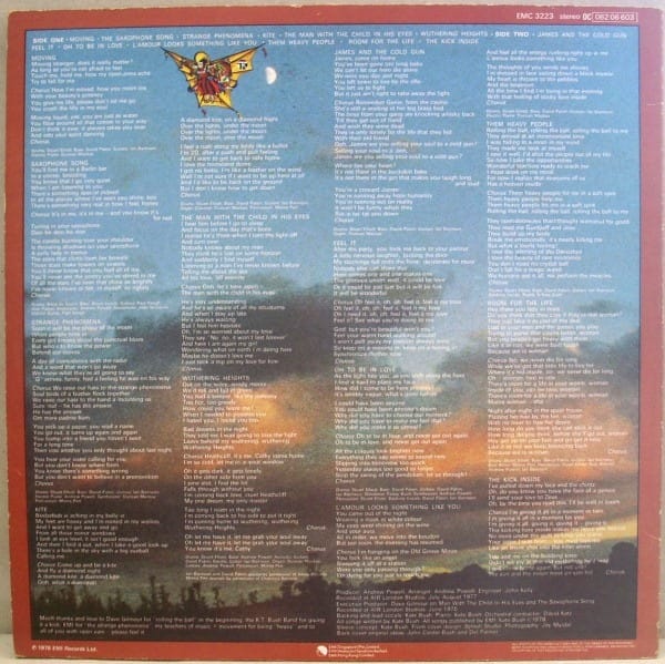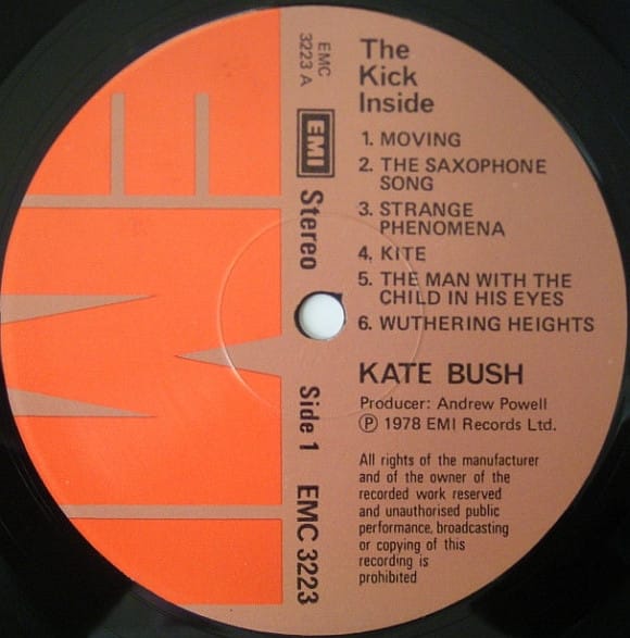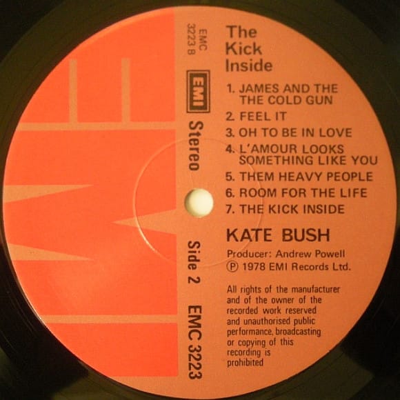 A1: Moving A2: The Saxophone Song A3: Strange Phenomena A4: Kite A5: The Man With The Child In His Eyes A6: Wuthering Heights B1: James And The Cold Gun B2: Feel It B3: Oh To Be In Love B4: L'Amour Looks Something Like You B5: Them Heavy People B6: Room For The Life B7: The Kick Inside